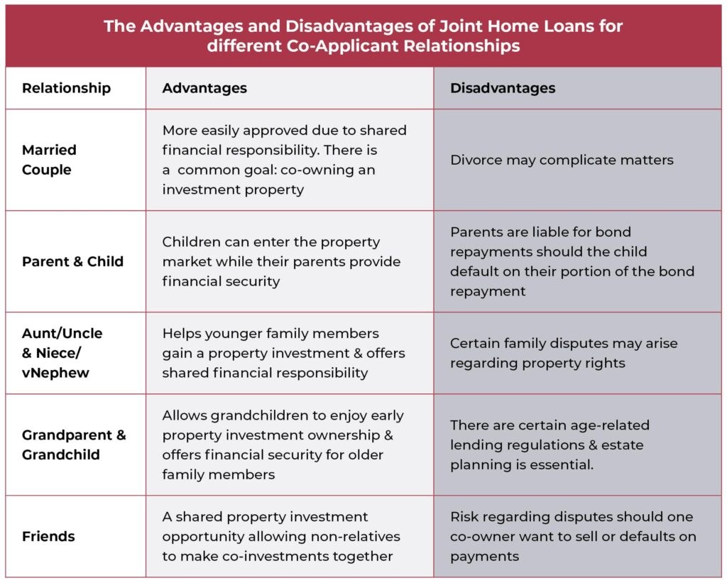 To help you as a potential joint home loan applicant make decisions regarding property investments, here is a Table showing you the Advantages and Disadvantages of a joint home loan in South Africa. This table compares these advantages and disadvantages alongside the different potential co-applicant relationships: